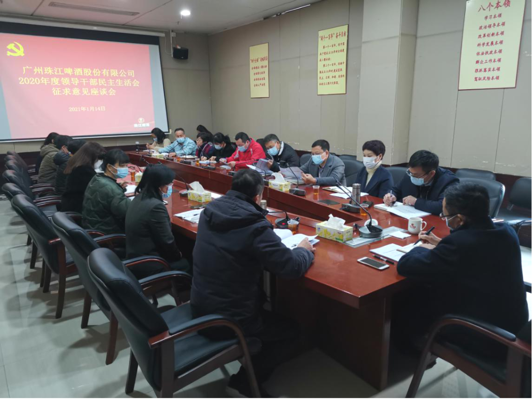 根据珠啤股份2020年度领导干部民主生活会有关安排,为扎实做好会前各项准备,确保民主生活会开出高质量、开出好效果,珠啤股份组成两个征求意见小组广泛征求各基层党组织党员、干部和群众的意见。2021年1月14日,第一组组长、珠啤股份纪委副书记、纪检监察室主任李飞会同党委巡察办、党委组织部组织管理一党支部、管理二党支部、营销党总支、工程文商党支部、珠丰公司党支部党员、干部和群众代表在总部召开珠啤股份民主生活会征求意见座谈会;1月15日,第二组组长、党委工作部部长王江红会同公司团委组织管理三党支部、设备信息党支部、物流党支部、南沙公司酿造厂党总支、南沙公司灌装厂党支部、南沙公司综合管理党支部党员、干部和群众代表在南沙公司召开珠啤股份民主生活会征求意见座谈会。珠啤股份党委书记、董事长王志斌主持两次征求意见座谈会。