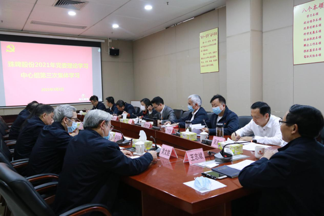 2021年3月3日,珠啤股份党委召开理论学习中心组(扩大)会议,进一步传达学习习近平总书记在党史学习教育动员大会上的重要讲话精神,以及广东省委、广州市委党史学习教育动员大会精神,并组织参观毛泽东同志主办农民运动讲习所旧址,拓展学习党史途径,提升学习成效。
