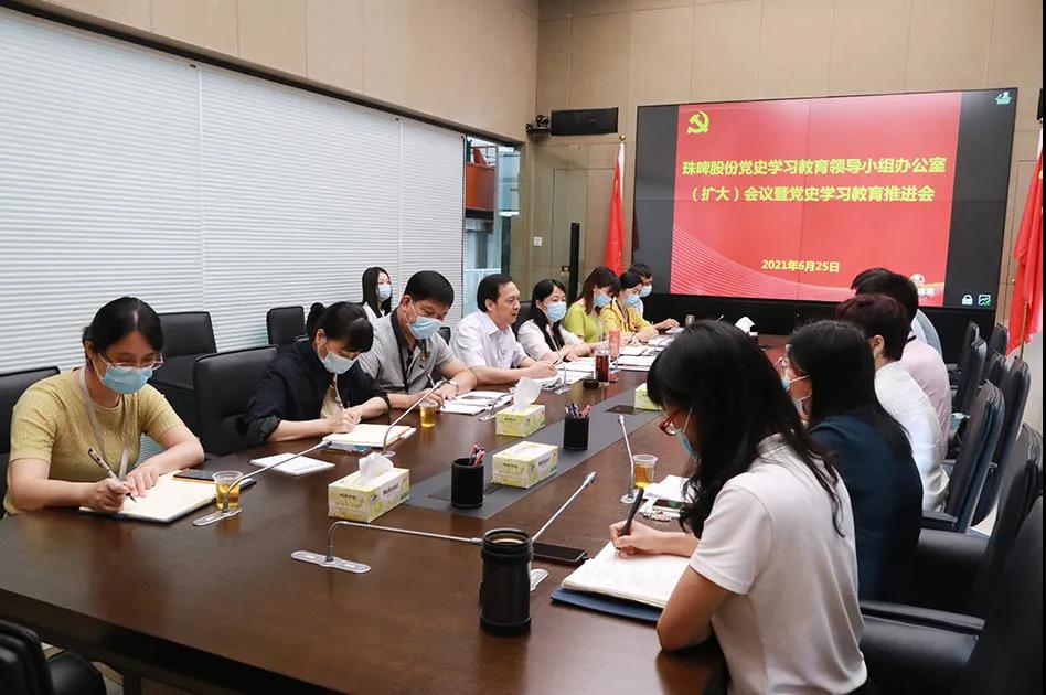 2021年6月25日,珠啤股份党委党史学习教育领导小组办公室召开党史学习教育推进会议,传达市委党史学习教育第十巡回指导组巡回指导工作会议精神,安排贯彻落实工作。珠啤股份党委副书记、工会主席吴家威,珠啤股份党委党史学习教育巡回指导组成员、各党组织负责人等参加会议,下属企业远程视频参会。