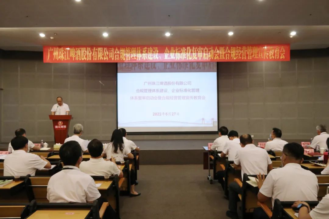 2022年5月27日,珠啤股份召开合规管理体系建设、企业标准化管理体系复审启动会暨合规经营管理教育会,珠啤股份总法律顾问何雄主持会议,珠啤股份领导班子、公司高管、各单位和部门主要负责人及2022年党务工作培训班学员等约200人现场或视频参会。