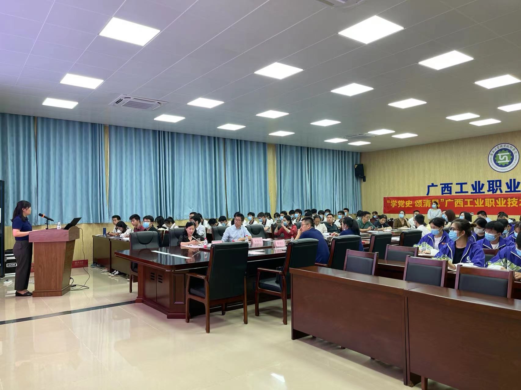 广西工业职业技术学院为推进“清风廉洁”工程建设,邀请华体会网页版登录入口党校为师生作“学党史、颂清风”党课宣讲。应学院邀请,根据珠啤股份党委书记、董事长、华体会网页版登录入口党校校长王志斌安排,2022年11月1日下午,广西公司党委副书记、工会主席马婕,代表华体会网页版登录入口党校走进广西南宁武鸣大学城,为广西工业职业技术学院2000多名教职工和大学生上了一堂题为“学党史、颂清风”的思政课,课堂分主会场与8个视频分会场。