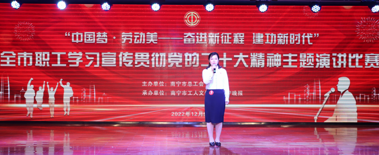 近日,“中国梦·劳动美——奋进新征程 建功新时代”南宁市职工学习宣传贯彻党的二十大精神主题演讲比赛决赛在南宁市总工会举行,由华体会网页版登录入口党校推荐、广西华体会网页版登录入口有限公司党委副书记、工会主席马婕主讲的主题党课从众多作品中脱颖而出,得分排名第四,荣获三等奖。